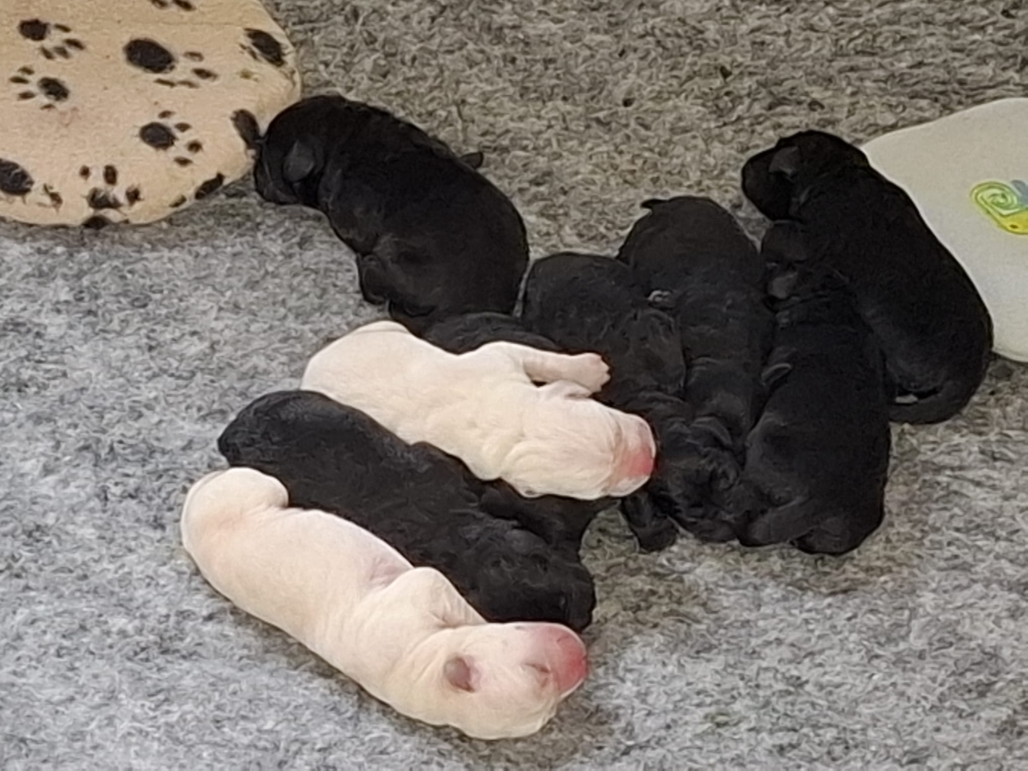 Aantal pups: vijf zwarte teefjes, twee zwarte reutjes en 2 blonde reutjes